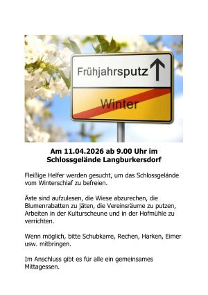 Äste sind aufzulesen, die Wiese abzurechen, die Blumenrabatten zu jäten, die Vereinsräume zu putzen, Arbeiten in der Kulturscheune und in der Hofmühle zu verrichten.