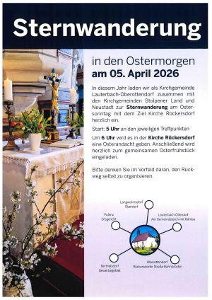 Um 6:00 Uhr wird es in der Kirche Rückersdorf eine Osterandacht geben. Anschließend wird herzlich zum gemeinsamen Osterfrühstück eingeladen.