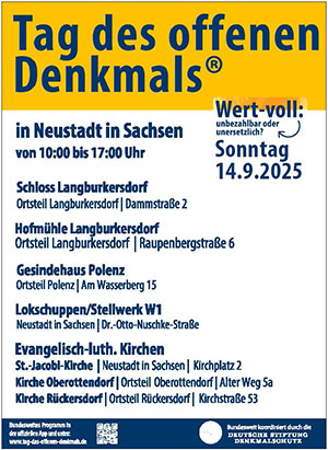 Orte: Schloss und Hofmühle Langburkersdorf, Gesindehaus Polenz, Lokschuppen/Stellwerk W1 und Evangelisch-luth. Kirchen (St.-Jacobi-Kirche, Kirche Oberottendorf, Kirche Rückersdorf)
